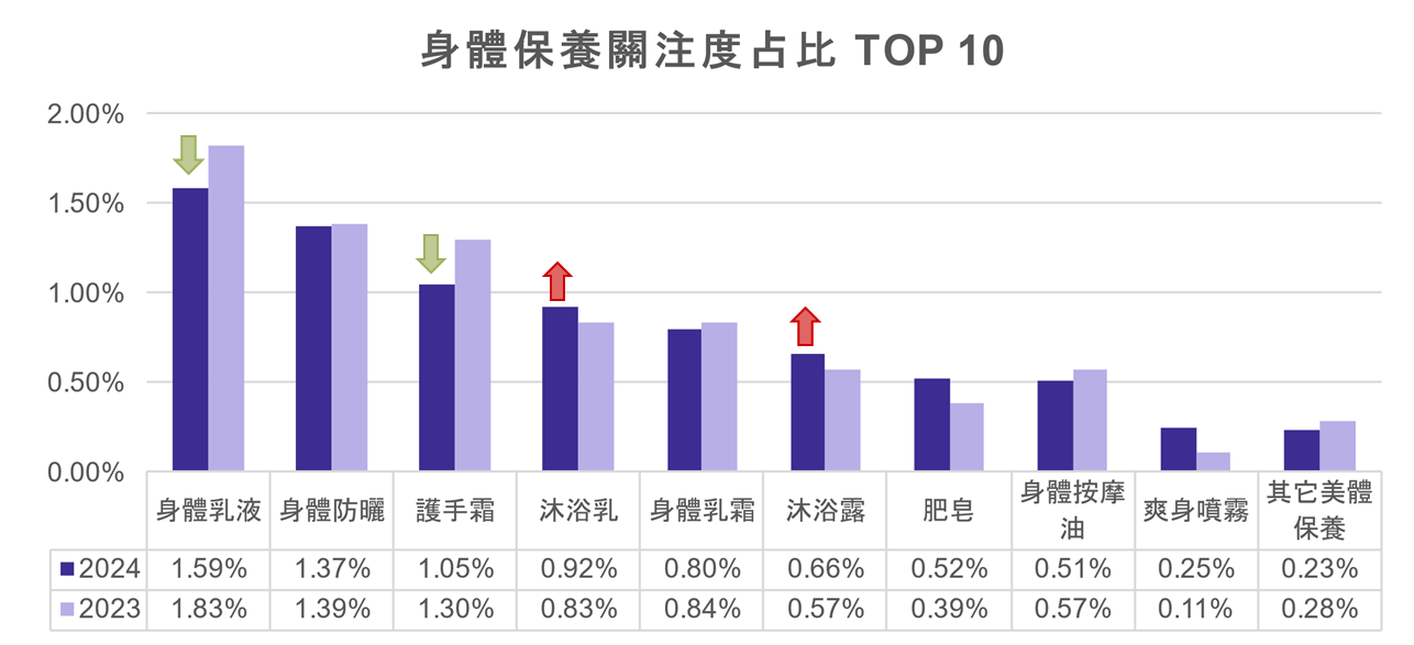 觀察身體保養關注占比TOP 10屬性,身體乳液雖然仍是最高,但在2024年占比較2023年度降低許多,反觀沐浴乳及沐浴露有所成長。
