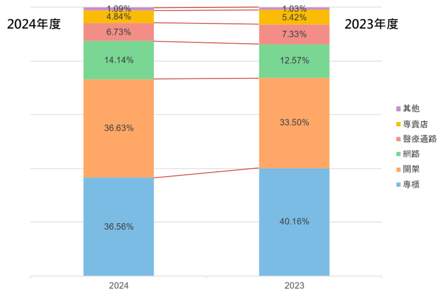 不分屬性的通路分布方面,整體關注度排序出現變動,開架通路聲量在2024年度大幅增加,由原本的第二大占比,躍升成為占比最高的通路。另外,網路通路也有小幅聲量增長。專櫃則是所有通路中占比降低最多的。