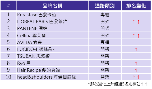 消費者於美髮產品的通路中,主要關注於開架及專櫃通路,其次則是網路與專賣店。在2024上半年除了開架及網路聲量提高,其餘通路皆下降。從關注TOP 10的品牌中也能看到,前10名中就有8名都是開架品牌,且有6個開架品牌的聲量都在今年上半年提升。