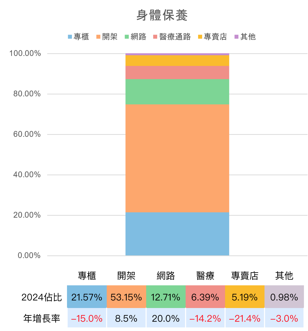 身體保養產品在2024年度和2023年度的關注總占比無太大變化,尤其是像前面提到的,今年夏季更為潮濕悶熱的關係,進入4月消費者使用身體清潔、爽身制汗等產品關注特別高,帶動整體身體保養關注占比自4月起開始增長。