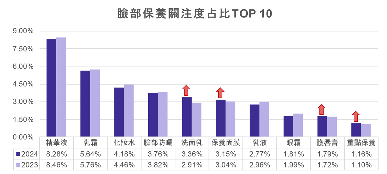 觀察下圖(4)的臉部保養TOP 10屬性關注占比,可發現熱門的臉部保養類別兩年度在排名上幾乎一樣,占比多為下降但差異也不大。關注最高的仍然是精華液,其次則依序為乳霜、化妝水、臉部防曬和洗面乳。