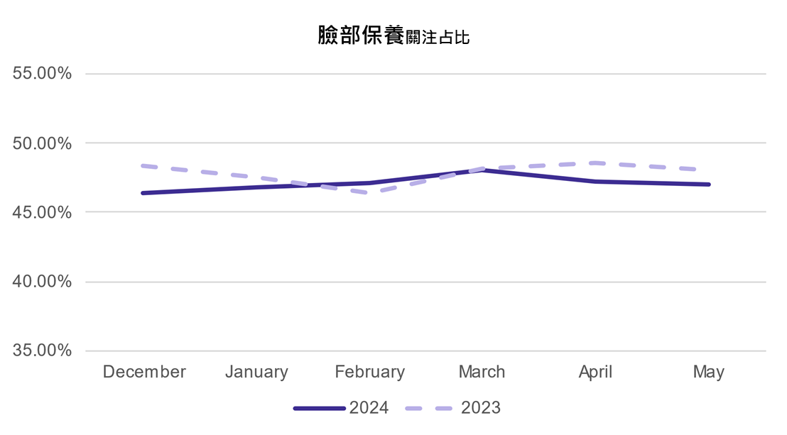 在2024上半年度中,臉部保養總關注占比和2023年度相差不大,月份走勢來看也都是在農曆新年後進入旺季,不過可發現今年4.5兩個月雖然遇到母親節檔期,但關注占比卻較低。
