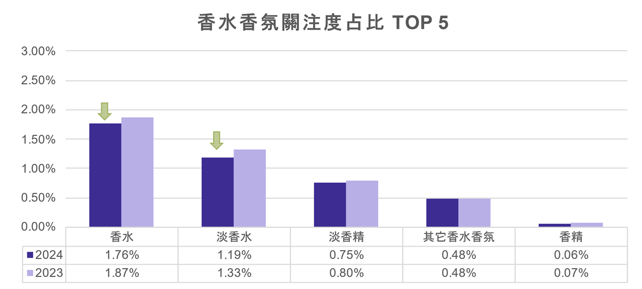 最後則是香水香氛,在2024上半年關注占比則有小幅下滑,但和2023年度相差不大。今年上半年一樣延續小眾香氛的趨勢,日韓也有不少新興香氛品牌開始進入台灣消費者的關注圈,如:Nonfiction、Tamburins、Aux Paradis等品牌在市場上都掀起不小討論度。