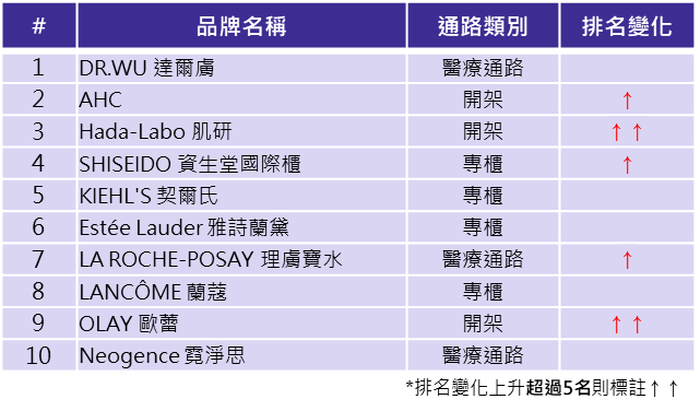 臉部保養的通路部分,消費者主要關注集中在專櫃及開架品牌,其次則是網路與醫療通路。透過關注度TOP 10的臉部保養品牌,也可發現關注前三高有兩個都是開架品牌,開架臉部保養的整體聲量有明顯提升。