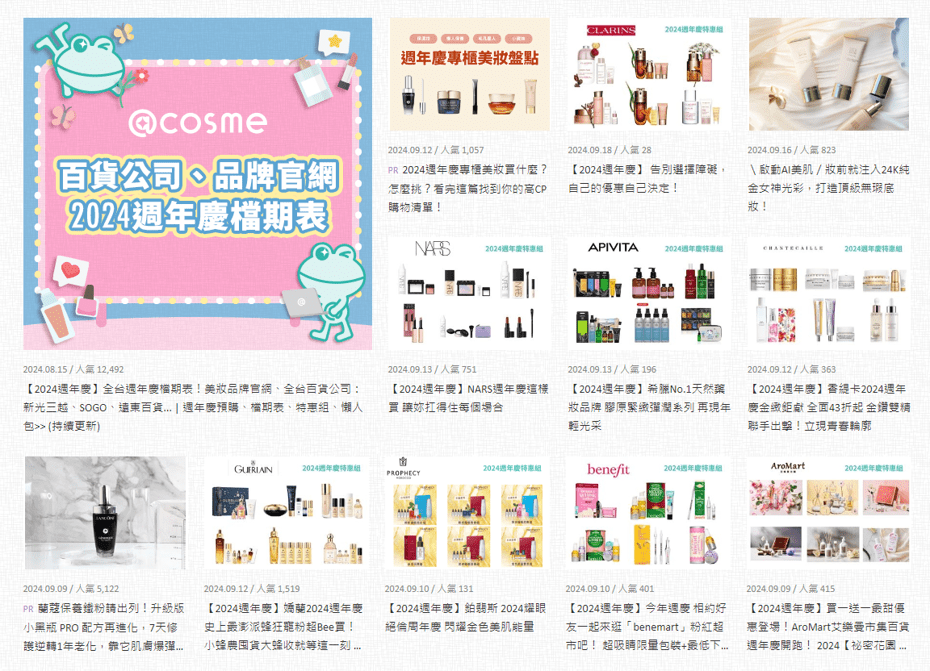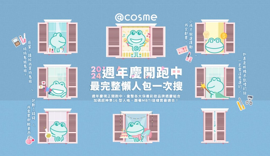 百貨週年慶開跑,事前功課做足了嗎?美妝綜合情報網站@cosme今年推出《2024週年慶開跑中 最完整懶人包一次搜》網站(https://www.cosme.net.tw/beauty-anniversary),除了彙整各大保養彩妝品牌週年慶組合、各大百貨檔期表,更加入時下最夯的MBTI人格特質分析,16人格怎麼買最適合一次搞定!