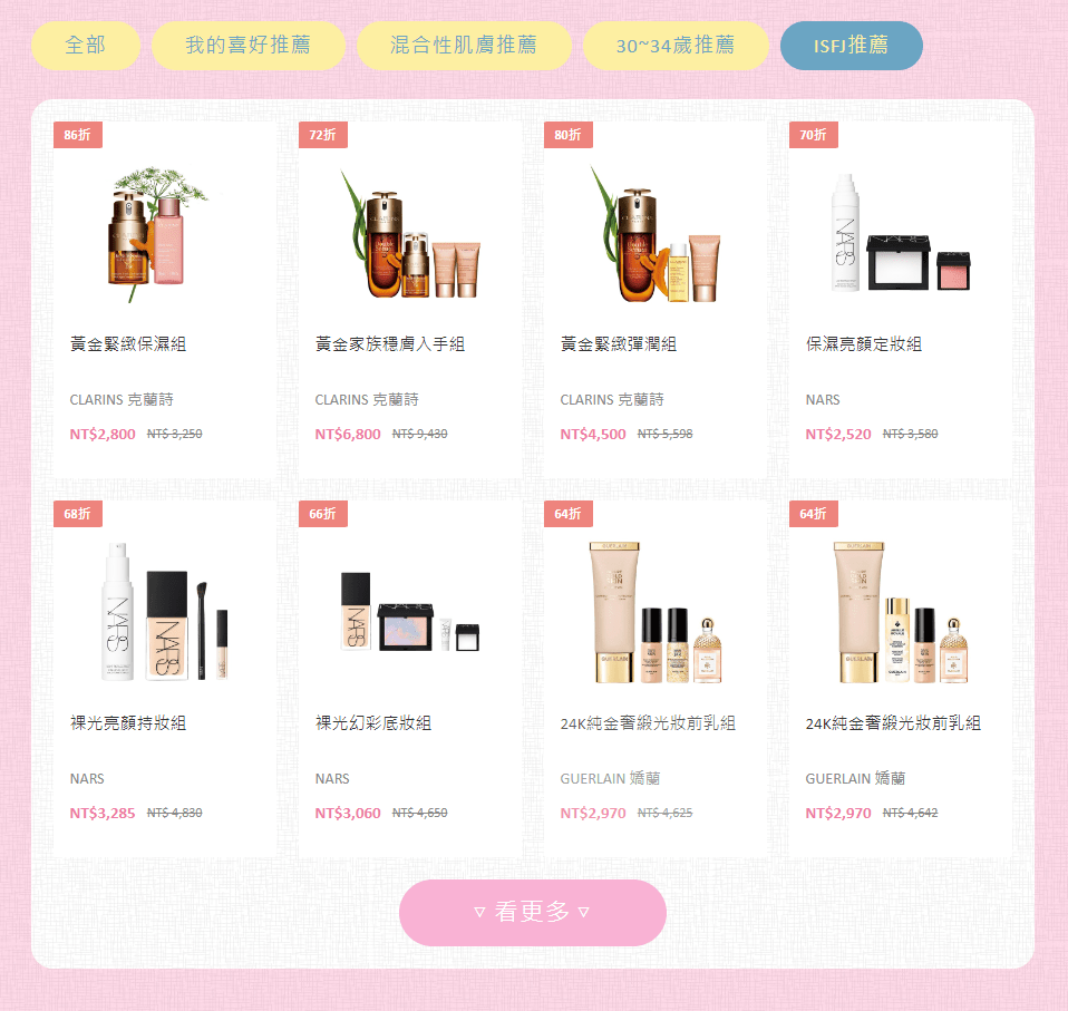 另外,從網友的清單來觀察,ENFJ人格共情力達到100分,購物習慣是「我1份、閨蜜1份」的熱愛分享特質,其中有網友是眼部保養魔人,也有回購度超高的品牌忠實者,慣用的產品幾乎很難被取代。只要進入活動頁面,就能依照指定品牌、屬性、價錢快搜特惠組,輕鬆找出最符合個人需求的產品,完全是小資省錢神器。
