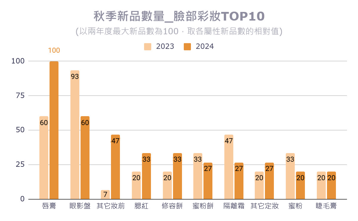 接著進入臉部彩妝類別,在今年秋季中臉部彩妝的新品總數較2023年減少12.5%,且總關注占比下降幅度較大(-29.5%)。