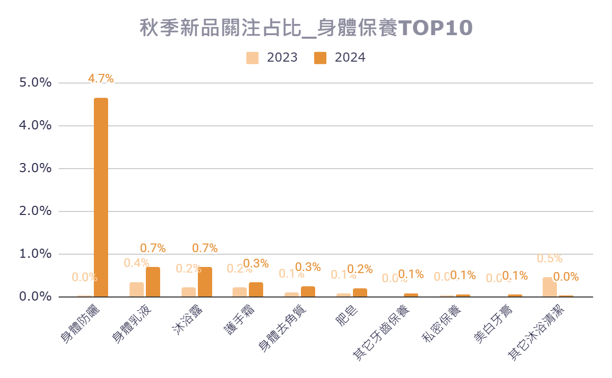 與之相反的,是關注占比在2024秋季提升最多的大類別–身體保養,和2023年度相比,今年秋季身體保養的新品數量差不多(-1.7%),但關注占比卻提升超過兩倍(+213.8%)。關注的提升主要都是受到身體防曬新品的帶動,隨著近年平均天氣也越來越熱,消費者在全年度對於防曬的關注都有所提升,尤其是DR.WU 達爾膚 全日清爽身體防曬乳,和同系列的臉部防曬一樣非常受消費者歡迎,為2024秋季中不分屬性所有產品關注度的第三名。