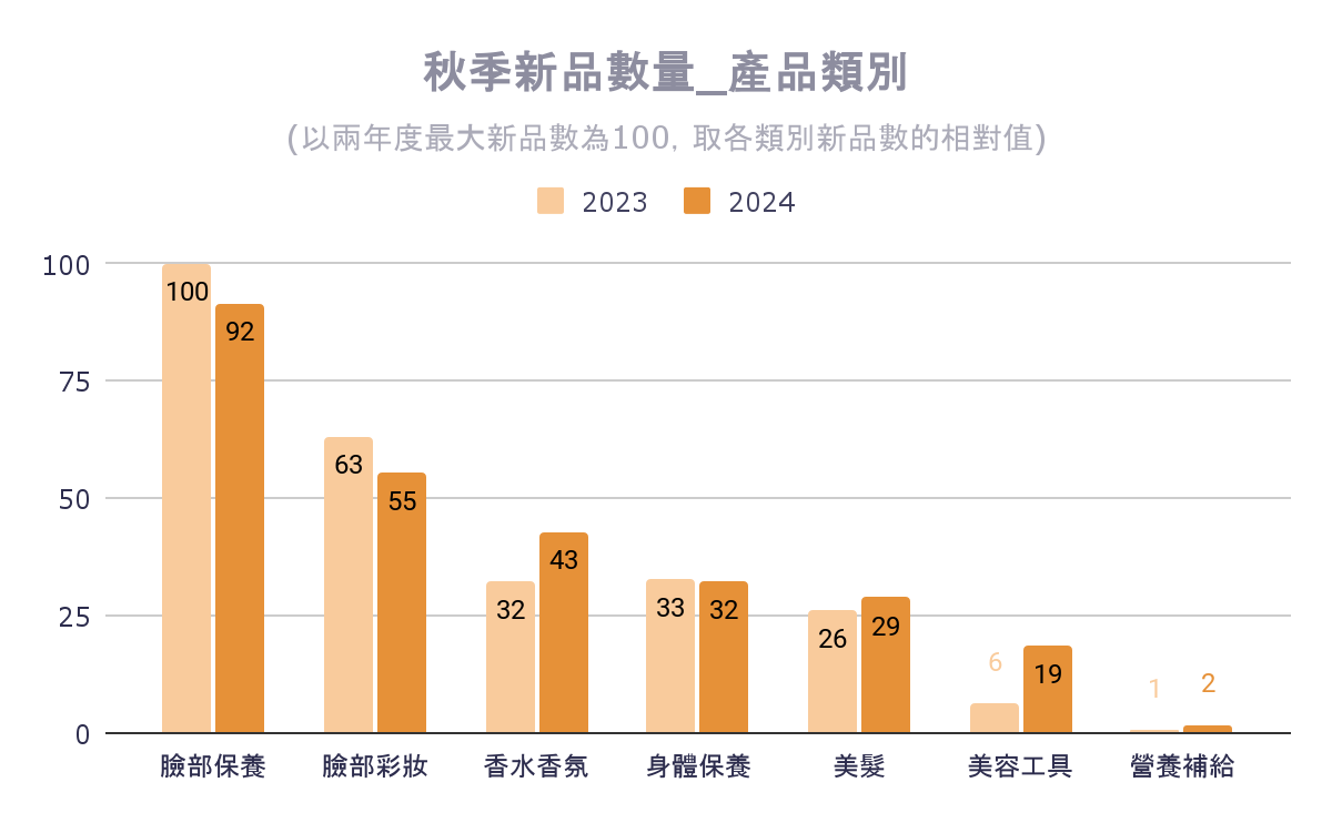 將新品分類別來看,可以看到臉部保養及臉部彩妝仍是新品數量最多的兩大類別,其中臉部彩妝新品數量減少最多(-12.5%),而美容工具及香水香氛則是2024秋季的新品數增長較多的兩大類別(分別為+200%、+33.3%),香水香氛的新品數量從第四名躍升為第三名的類別。