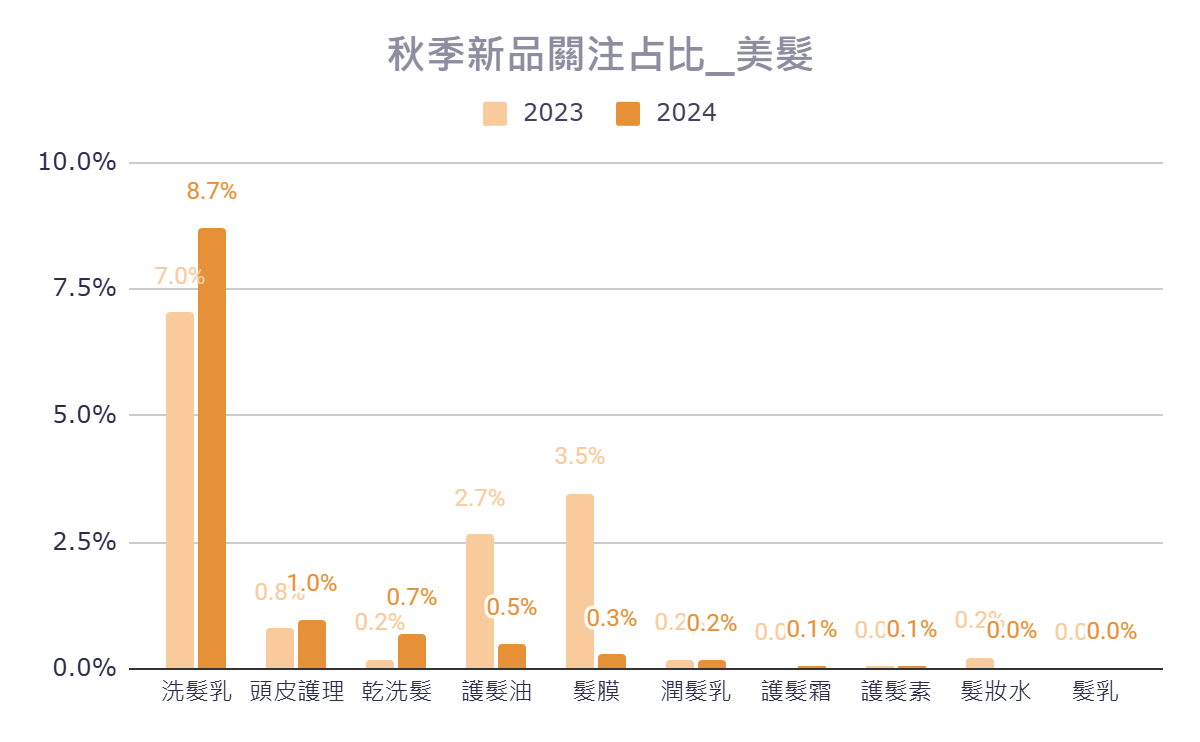 再來進入關注占比第三名的美髮產品,雖然在2024新品數量成長了10.9%但關注占比卻掉了39.6%,主要是因為在2023年有非常熱門的染護髮新品 (含染髮、護髮及髮膜等),在2024秋季則較缺乏高關注的新品。