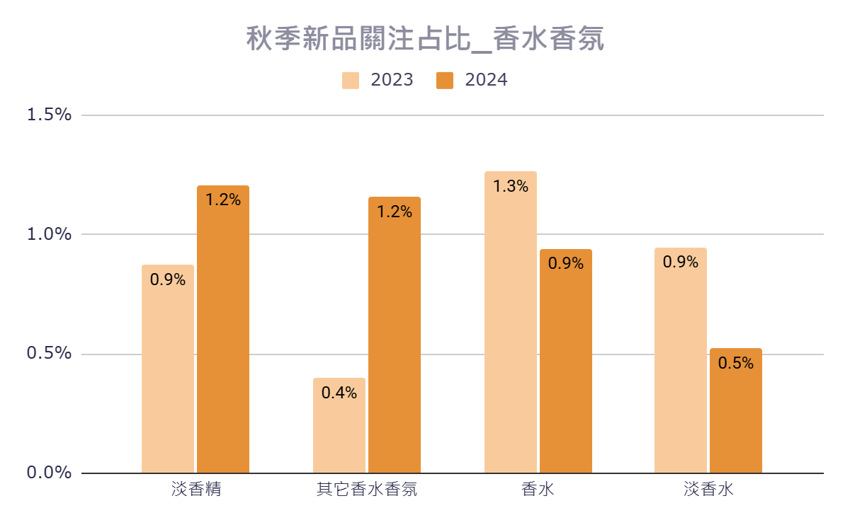 香水香氛方面,雖然總量增幅不大,但淡香精及其他非傳統香氛產品,如家居香氛等逐漸受到更多關注,顯示消費者對生活儀式感的需求在上升。