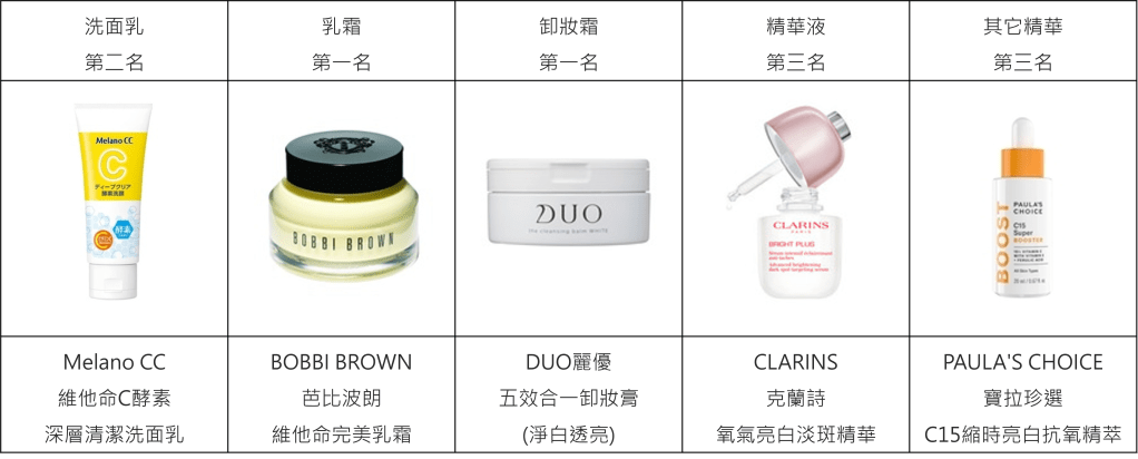 同時也因為氣候逐年濕熱,更容易感受到強烈的紫外線威脅,消費者除了追求高防曬係數產品來維持肌膚健康之外,對於改善膚色不均、斑點的需求也提升,例如含有維他命成分的Melano CC「維他命C酵素深層清潔洗面乳」、BOBBI BROWN芭比波朗「維他命完美乳霜」;有著美白或淡斑功效的DUO 麗優「五效合一卸妝膏(淨白透亮)」、CLARINS 克蘭詩「氧氣亮白淡斑精華」、PAULA’S CHOICE 寶拉珍選「C15縮時亮白抗氧精萃」等,以及在2024下半年新秀賞的營養補給DHC「持續型維他命C」,都可以看出不論是外用或內服,大眾更追求白皙、透亮的肌膚保養。