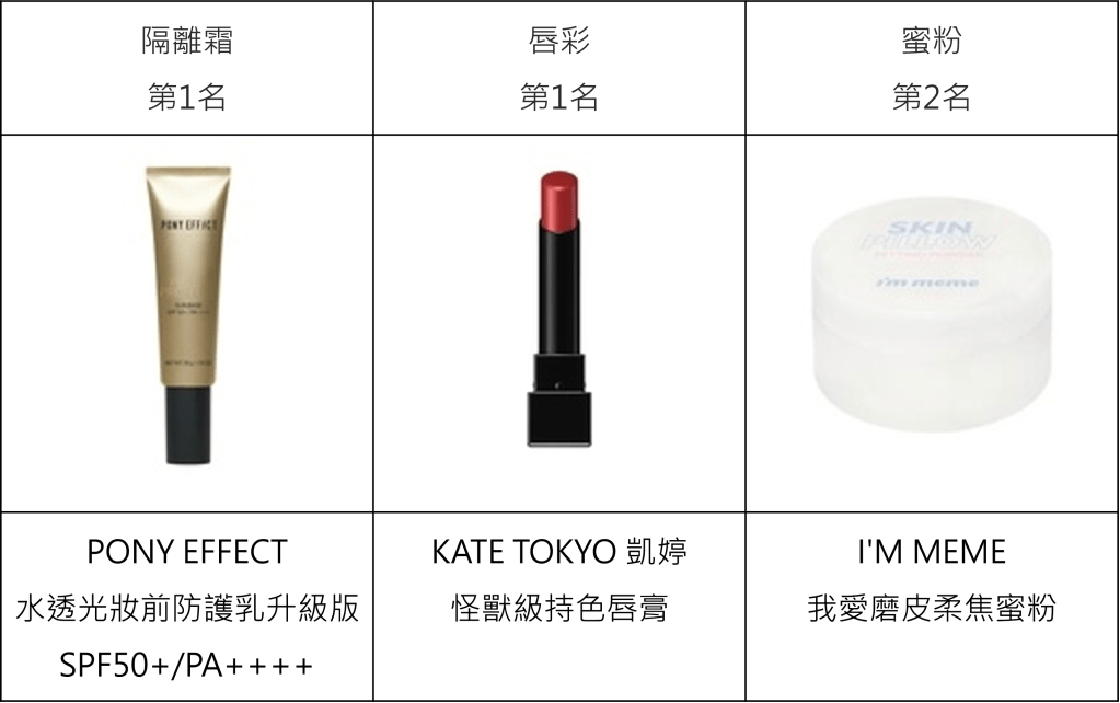 結合以上報告與得賞榜單,雖然今年與去年同樣有6支防曬產品入榜,在今年更加溼熱的氣候下,消費者對於臉部防曬產品的需求提升,除了最基本的高防曬係數外,結合多重功效的產品更能擄獲消費者的心。具有亮白功效的Melano CC「維他命C亮白UV精華乳」、潤飾校色的Bioré「高防曬無瑕潤色隔離乳」、DR.WU 達爾膚「全能保濕潤色防曬乳」都因此獲得好評。
