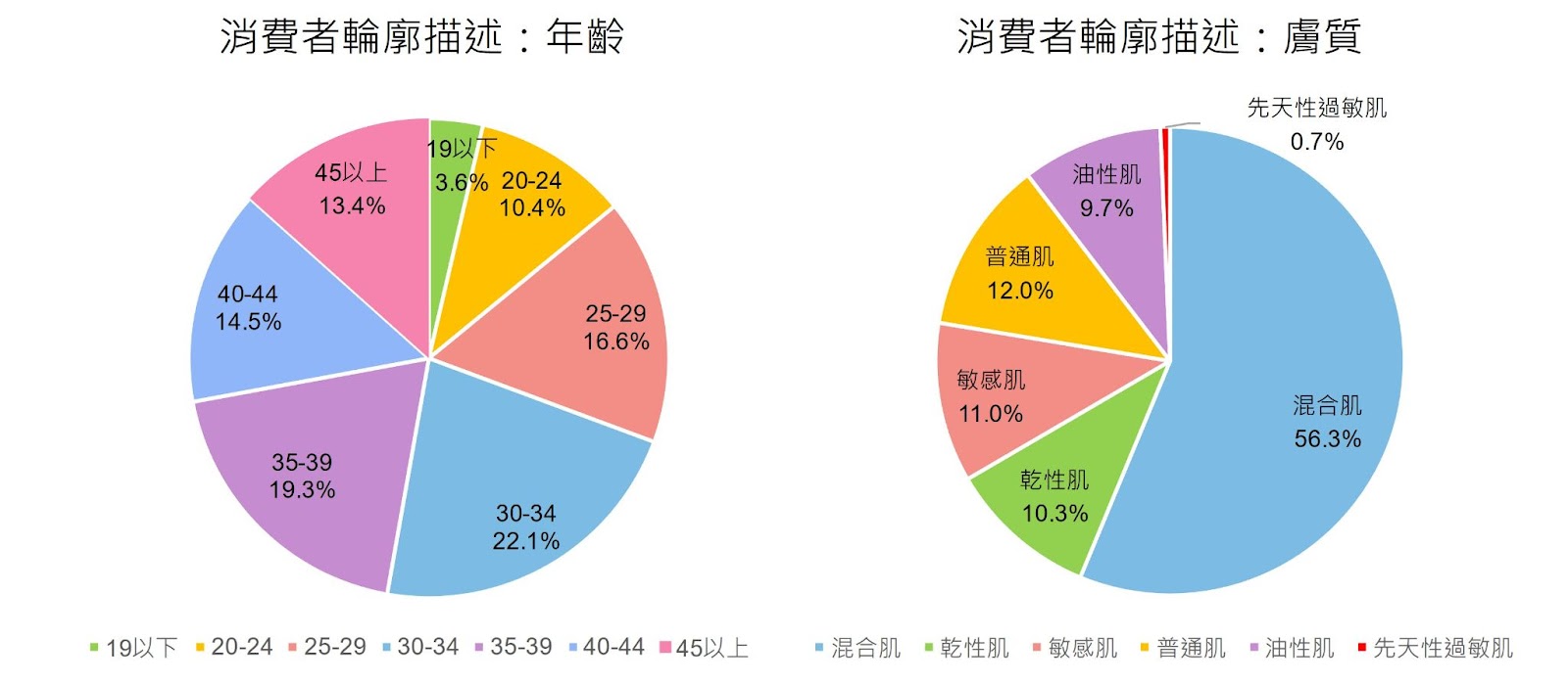 我們先看@cosme平台會員的整體輪廓,在年齡與膚質的分布(如下圖)。@cosme站上的整體消費者年齡的部分主要是集中在25到39歲之間,膚質則以混合肌為最大宗,其次則是乾性肌、敏感肌、普通性肌膚、油性肌等等。