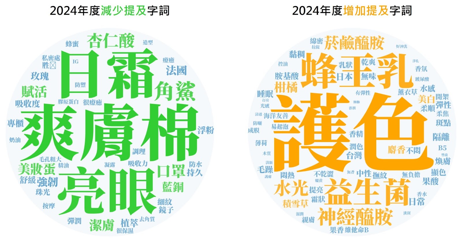 進一步去分析這些字詞在2024年度的增長率,可以看到除了前面提到消失的字詞外,2023年度掀起廣大討論度的爽膚棉在2024年的討論聲量下降非常多;而討論聲量大幅增加的字詞中,一樣有許多都是成分字,值得一提的是,護色是2024年度討論聲量增幅最大的字詞,推測也和近年有越來越多消費者有染髮或漂髮所帶來的影響。