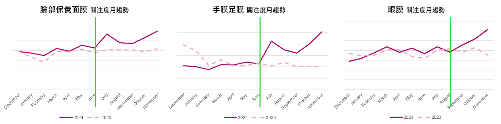 進一步來看面膜類產品在2024的關注趨勢,發現從夏季出遊開始帶動關注提升,到秋冬消費者對面膜的關注持續上升,且除了臉部面膜外,手膜和足膜等產品也逐漸受到青睞,顯示出消費者對保養精緻化護理的關注增長。
