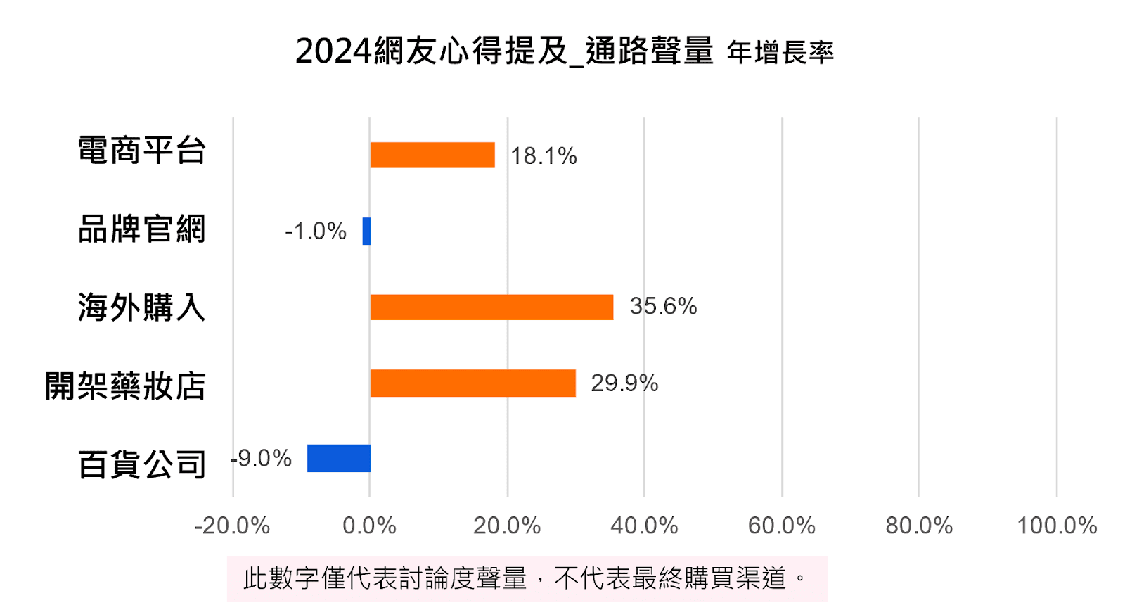 另一方面,將兩年度使用心得中消費者提到的所有通路相關字詞做分析比對(如下圖),也能看出線上通路的持續聲量提升,像Momo與蝦皮這樣的電商平台依舊穩居主流,而酷澎等新興平台則以更靈活的策略快速崛起。與此同時,在實體中,開架藥妝店則成為消費者更常討論的通路,除了台灣常見的屈臣氏、康是美與寶雅外,一些海外開架藥妝店如Olive Young和大國藥妝也有明顯的成長性。