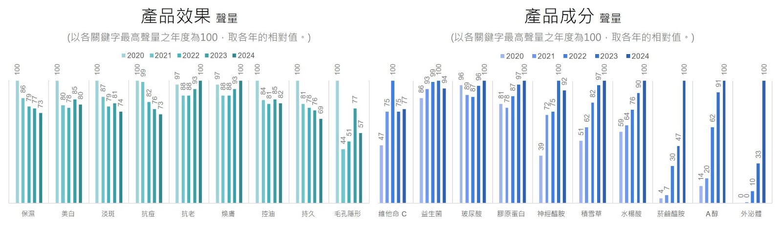 除此之外,我們也發現消費者對產品成分的在意程度有所提升。伴隨著美妝產品的「成分透明化」,有越來越多的成分被消費者所認識。過往消費者在選購時,可能更著重於產品效果,但現今更多的消費者會優先關注產品成分,偏好從成分來尋找合適的產品。同步也推動近幾年有更多新興成分(如:外泌體、PDRN等)的研發與崛起。