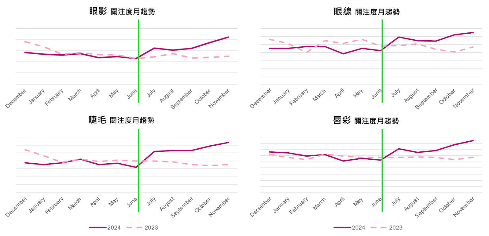 與此同時,在眼唇妝容也展現出不容忽視的回暖跡象。自暑假起出遊聚會增加,又搭配年末各種節日,美妝品牌推出限量包裝、禮盒或色號外,再伴隨近年妝容流行強調眼唇重點,種種原因都讓2024下半年,消費者對於眼唇妝容的需求大幅增加。