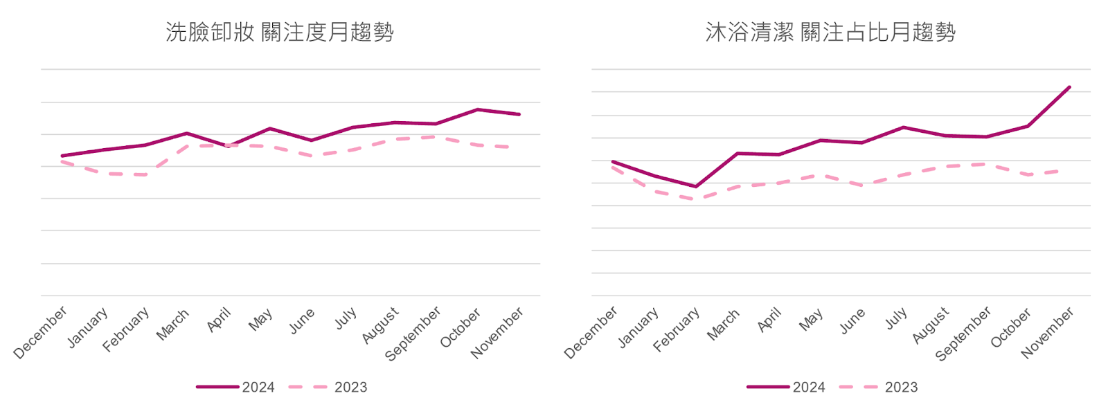從上一篇文章中,就能夠發現2024年度在臉部與身體方面,清潔產品的需求穩步增長(如下圖),從洗臉卸妝到身體的沐浴清潔,在2024全年度關注度都持續呈現上升趨勢。從更為關注的效果中也能看到,除了對清潔力的要求外,消費者也格外注重清潔用品能夠維護肌膚的健康度,並儘量減低傷害肌膚。