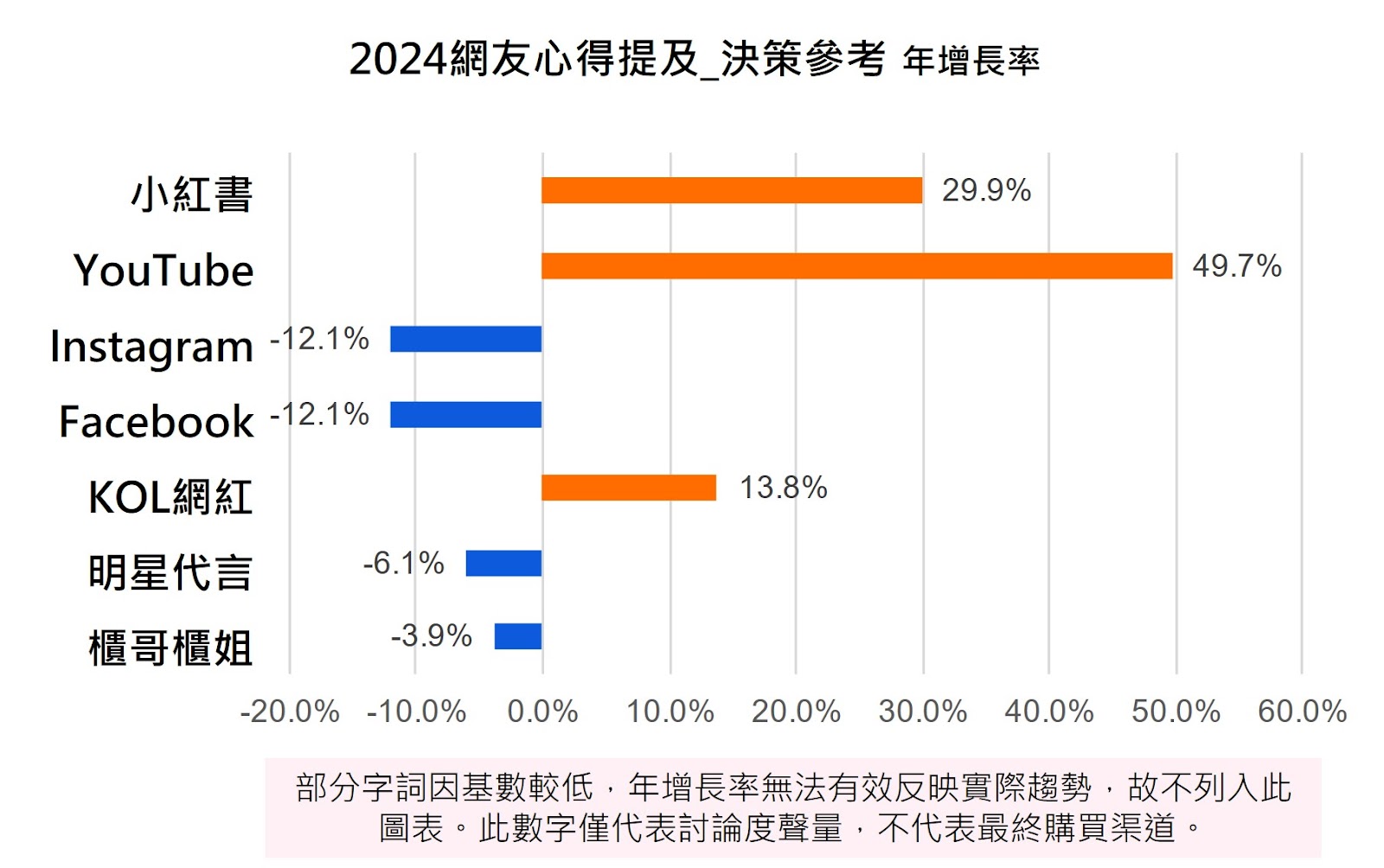最後一個洞察,則是關於消費者在做產品比較檢討時關注的焦點轉移有關。近年,各式多元SNS社群平台的影響力越來越重要。其中在2024年,更是能從下圖使用心得中的討論提及發現社群平台種類影響力的分散轉移。從YouTube、TikTok等影音平台到小紅書、Threads等新興平台的影響力越來越重要。