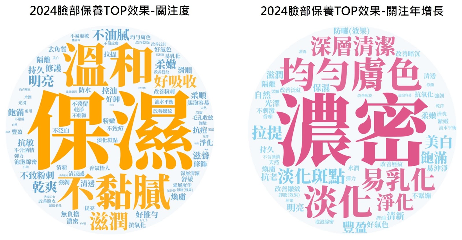首先,是臉部保養產品的效果關注,和2023年度一樣,2024年中消費者最關注的臉部保養效果前五名依次為保濕、溫和、不黏膩、滋潤及好吸收。但若觀看年增長率較高的效果字,則能看出消費者在2024對於洗臉及卸妝等清潔相關效果關注成長明顯,另外,也格外更追求膚色的均勻度和乾淨感。