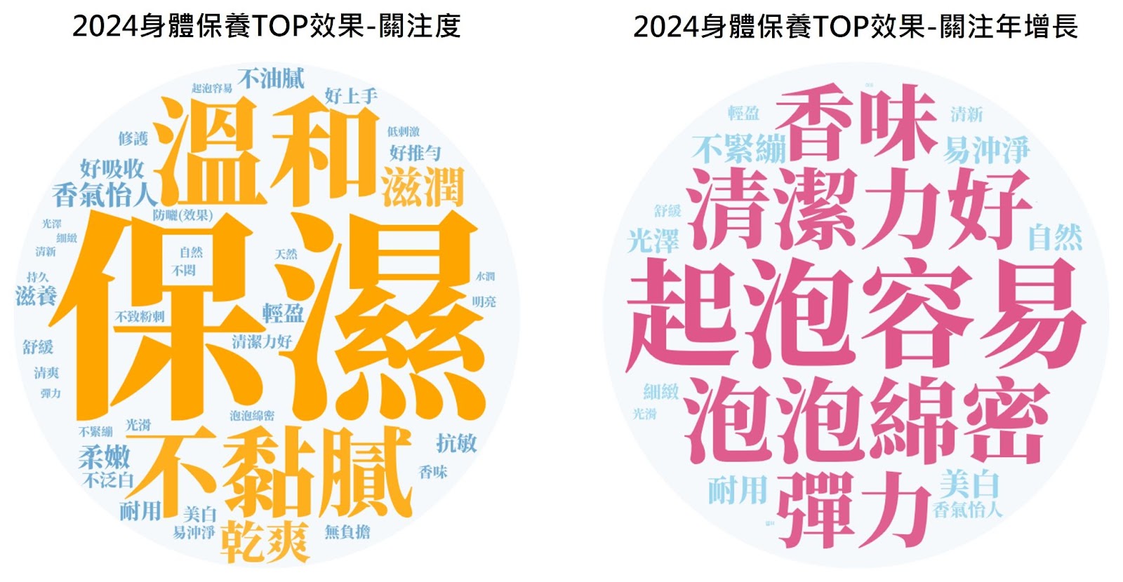 在身體保養的效果上,關注度較高的效果和臉部保養很相似,前五名分別為保濕、不黏膩、溫和、滋潤及乾爽。而關注成長較高的效果,可以很明顯看到許多都是沐浴清潔相關的效果,再次展現出沐浴清潔產品在2024年度中是身體保養的一大亮點。