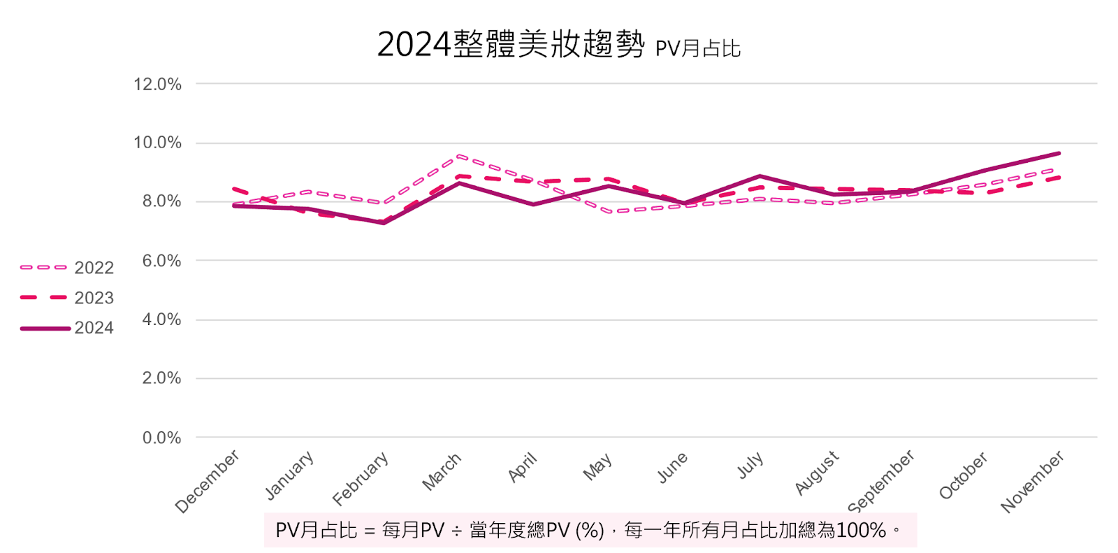在過去,每年的母親節與百貨週年慶一向是美妝市場的兩大檔期,消費者習慣於這些時刻大量購入甚至囤貨,為自己或親友挑選心儀的產品。然而,我們觀察到近幾年的美妝市場卻悄然改變,數據顯示,季節性高峰不再像以往那樣鮮明(如下圖)。
