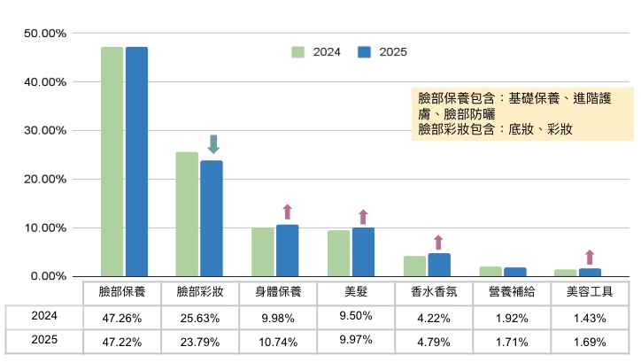 2025年美妝市場的類別關注排序與去年大致一致,臉部保養與臉部彩妝仍居前兩位。臉部保養占比約47%,與2024年幾乎持平,穩居市場核心地位。然而臉部彩妝出現明顯下滑,從2024年的25.6%降至23.8%,下降近2個百分點,是今年變化最顯著的屬性。