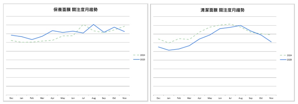 進一步區分面膜內部,保養面膜與清潔面膜在2025年呈現分化表現。保養面膜關注度穩定上升,為今年少數成長的小屬性;清潔面膜在8月以前關注度明顯低於去年同期,表現偏弱,在面膜TOP10中僅佔兩席。此結構差異顯示,2025年面膜市場關注重心更傾向補水、舒緩與修護等保養導向需求,清潔型面膜影響力相對下降。