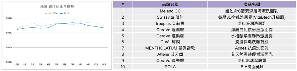 拆解洗臉小屬性趨勢,洗面乳仍是關注核心,但2025年整體關注度略為下滑;其他洗顏類型占比則明顯抬升,為較突出的變化。