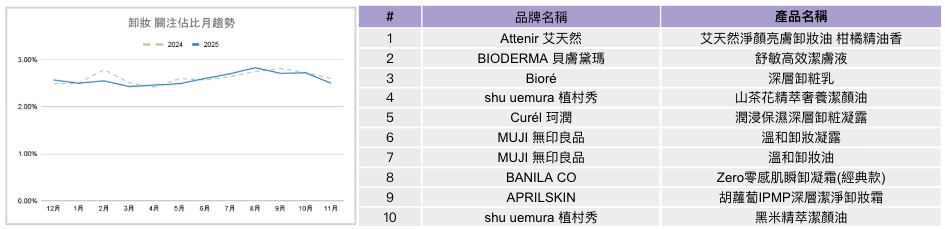 緊接著是卸妝類別。整體而言,2025 年卸妝的關注度略低於去年,且全年波動幅度不大,顯示其仍屬於相對穩定的基礎型品類。不過在品牌結構上可觀察到些微變化,無印良品今年共有兩項產品進入關注度前十名,使其在卸妝榜單中的能見度明顯提高。此一現象顯示,除傳統美妝品牌外,專賣店通路旗下的自有品牌在卸妝品項中的關注表現正逐步提升,為該品類帶來結構上的變化。