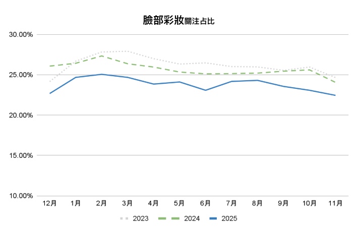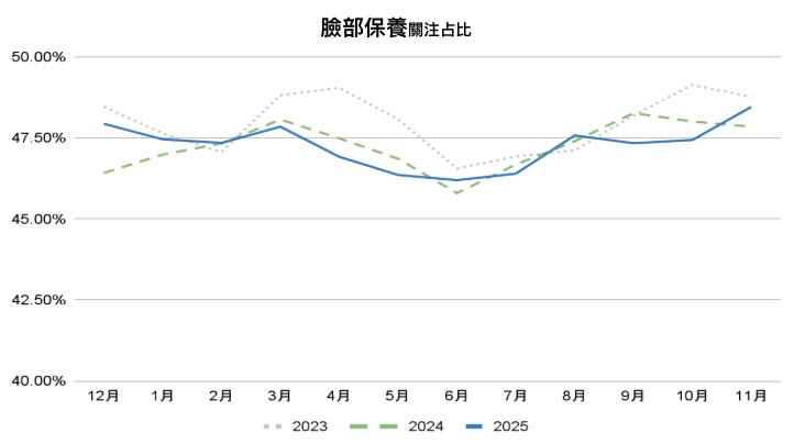 從臉部保養的月度關注度變化來看,2025 年整體水準與 2024 年相近,全年大致維持在 46% 至 48% 的區間內,顯示臉部保養仍是市場中最穩定的核心品類。相較 2023 與 2024 年,2025 年的走勢波動幅度明顯較小,顯示關注分布趨於平均,未出現過度集中的單月放大。