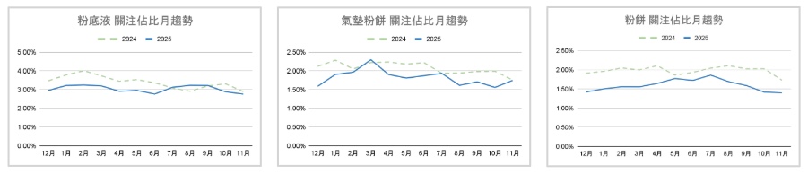 聚焦粉底類產品的月度走勢,可以清楚看到 2025 年的關注度幾乎全年度皆低於 2024 年,兩年之間呈現穩定且持續的落差,且波動幅度相對有限。這顯示粉底作為彩妝中的核心品項,今年並未出現明顯的季節性放大或關注動能回升,整體熱度維持在相對低檔水準。