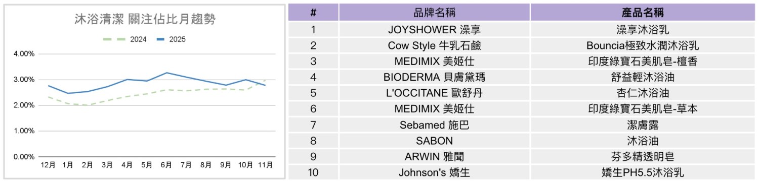 沐浴清潔是今年身體保養中表現穩定且具支撐力的品類。2025年關注度大多時間略高於去年,整體維持在約3%的水準。