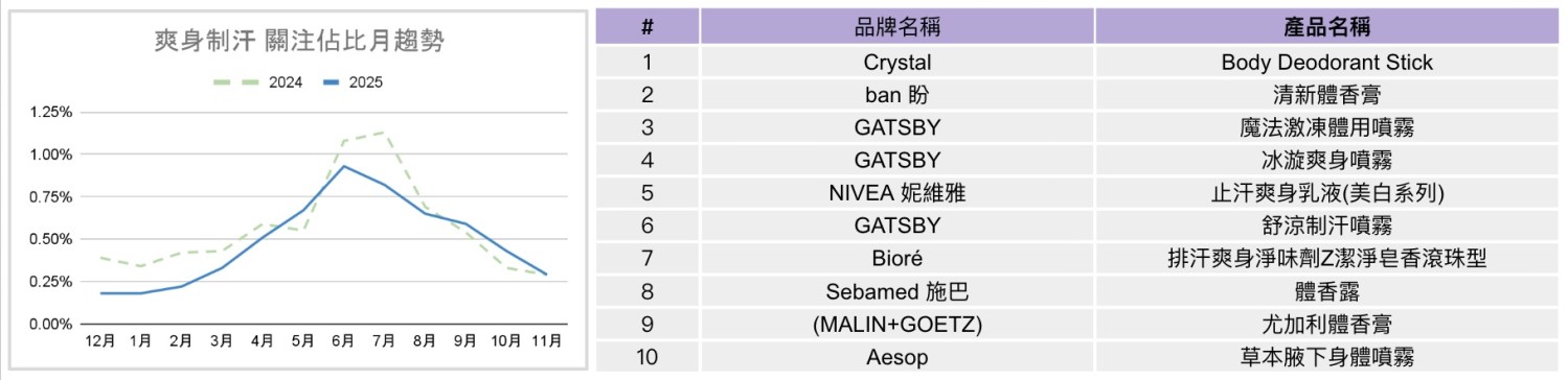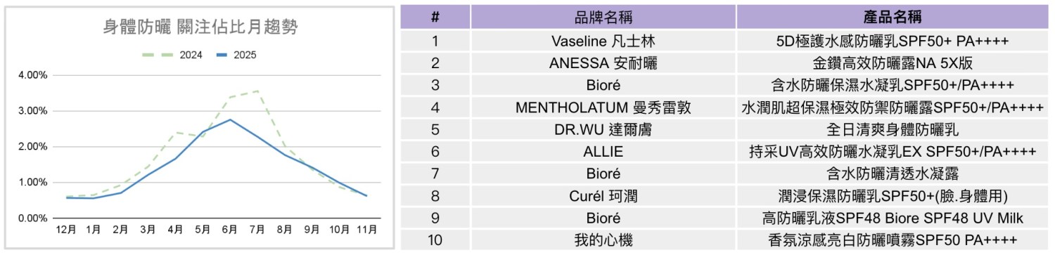 與前兩年相比,2025年身體保養多數月份關注水準皆高於2024年,在臉部保養與彩妝關注趨緩的背景下,身體保養維持成長動能。