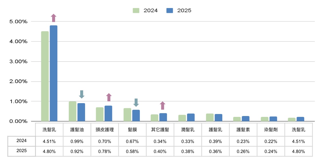 從屬性結構來看,洗髮乳仍為美髮市場的絕對主力,且 2025 年占比持續小幅提升,顯示基礎清潔需求仍是整體關注的核心支撐。相較之下,護髮油、髮膜等偏重深度修護的產品,2025 年關注度明顯低於去年,未能延續成長動能。相對地,輕量型、日常維持導向的品項(如護髮素、潤髮乳及其他護髮類別)則出現小幅成長。