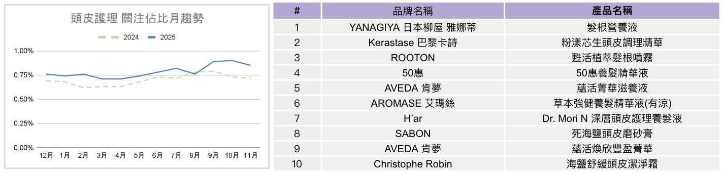 接著來看頭皮護理。整體而言,2025 年頭皮護理的關注度呈現穩定微幅上升的走勢,全年水準略高於去年,顯示頭皮相關需求仍在持續累積,但並未出現明顯爆發,關注波動幅度相對有限,屬於穩定成長型品類,未呈現明顯季節性。