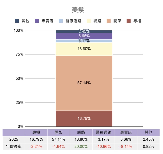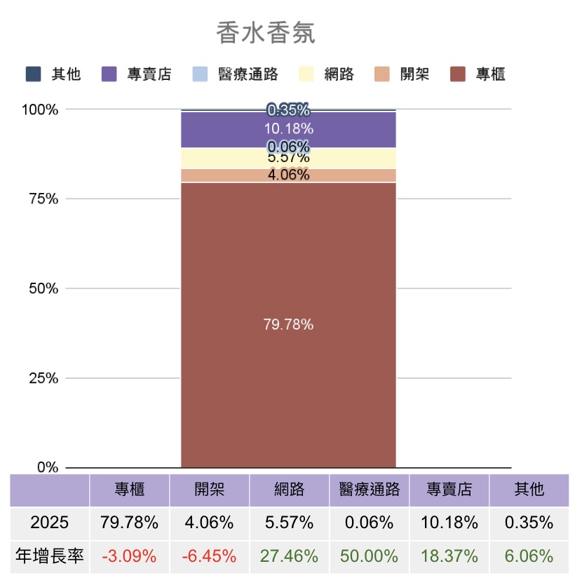 同時,網路與專賣店通路的成長動能逐步浮現。網路通路年增率達 +7.48%,專賣店亦有 +7.26% 的成長,雖整體占比仍低,但顯示消費者關注正逐步分散至非傳統主力通路。
