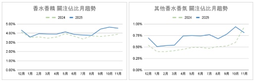 進一步看月度變化,香水本身在 2025 年整體維持高於去年的水準,下半年關注度明顯拉升,延續了香氛在年度後段走強的趨勢。而「其他香水香氛」的成長更為明確,2025 年幾乎全年都高於 2024,且在下半年持續墊高,顯示消費者對非典型香水型態(如香氛噴霧、香氛水等)的關注度正在提升。
