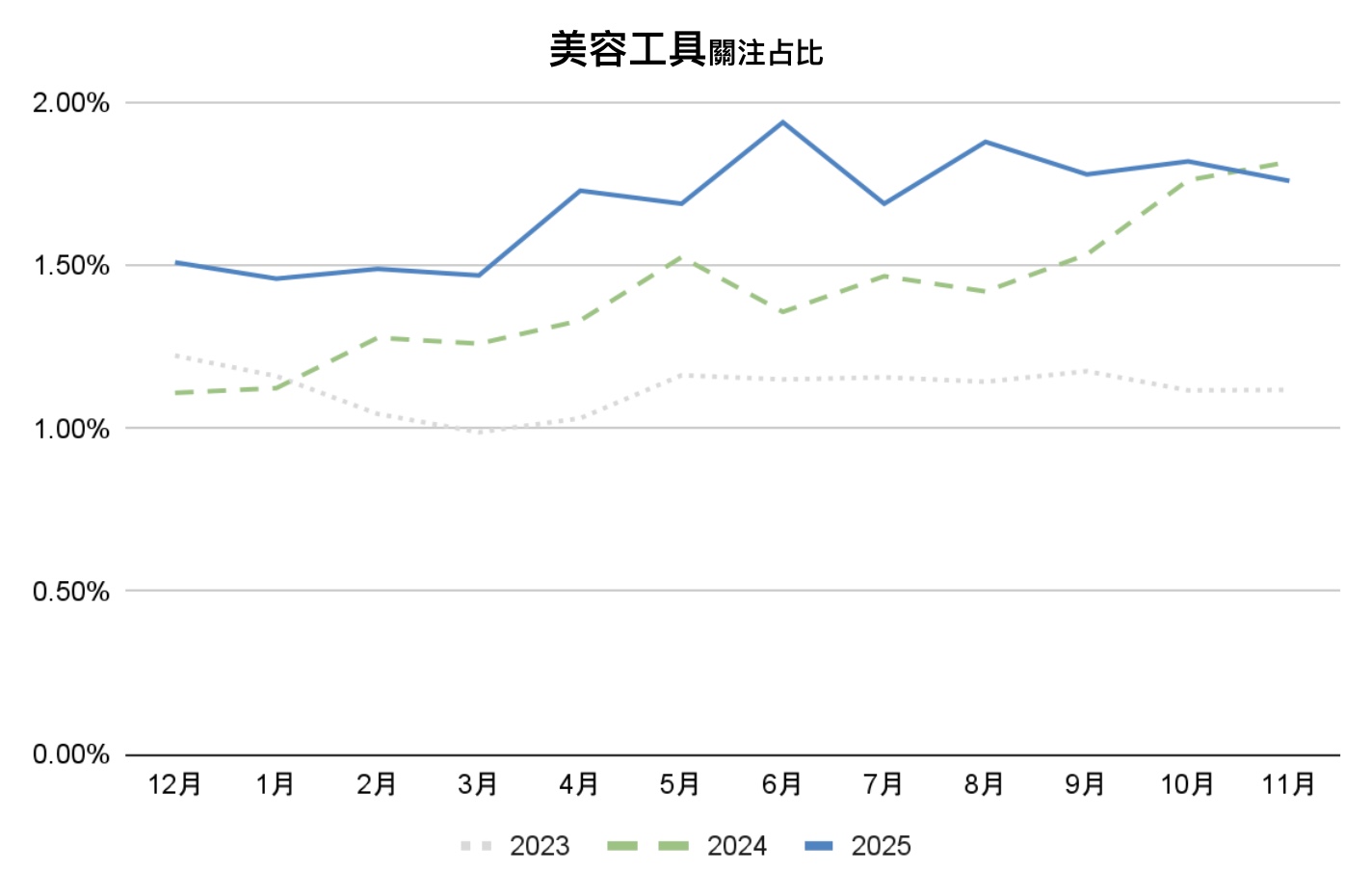 2025年美髮關注度大致維持在9.5%至10%之間,全年表現明顯高於2023年,且多數月份略高於2024年,呈現穩定、緩步上移的結構。與臉部彩妝不同,美髮關注未出現明顯季節性高低落差,維持平穩區間,屬全年型、持續性需求品類。