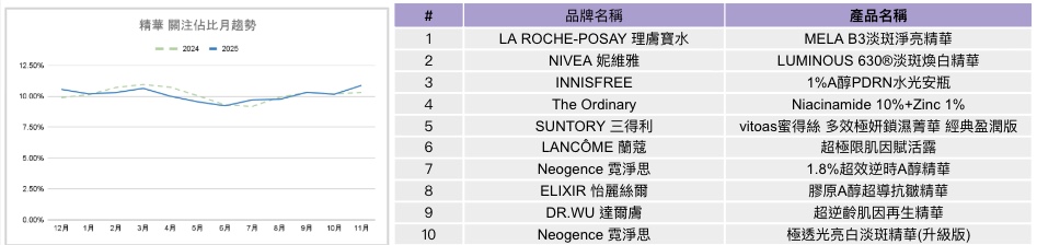 精華類涵蓋前導精華、精華液、精華水、精華油、安瓶及其他類型。2025年精華整體關注度略低於2024年,自1月後即落在去年同期之下。不過,關注度自7月後逐步回升,11月小幅超越去年同期,呈現前段偏弱、後段回升的走勢。產品層面上,2025年精華關注度前十名品牌延續性高,多數為去年即具高能見度的核心品牌,部分品牌以同一產品線的不同版本或升級形式持續上榜。