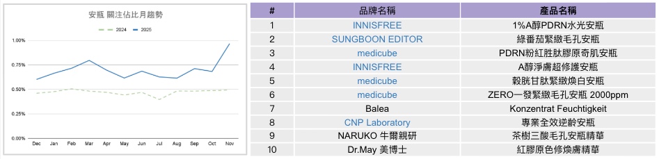 進一步拆解精華內部結構,本波關注回升主要由安瓶帶動。安瓶目前在精華整體中占比仍低,但成長幅度明顯,關注占比由年初約0.6%提升至接近1%,10月出現明顯跳升,對精華整體下半年超越去年同期具有實質貢獻。安瓶上榜產品有半數以上的韓國品牌,顯示韓系品牌在高濃度成分訴求與安瓶型產品的市場教育上仍具明顯優勢,持續主導此一細分品類的關注走向。相較精華液等日常型品項,安瓶在精華內部形成較具辨識度的子結構,後續可觀察其是否持續擴大市場存在感。