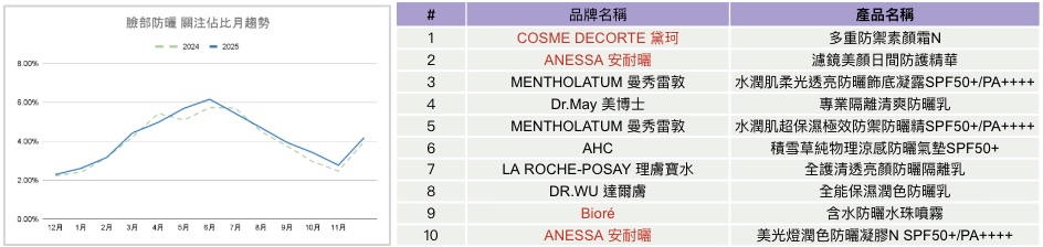 臉部防曬走勢具明確季節性特徵。2025年關注度自年初逐步上升,於春夏交替期間達到高點並超越去年同期。2024年防曬關注高點落在4至7月,熱度延續較長;2025年則呈現高峰集中、後續回落較快的型態。產品結構上,臉部防曬前十名中日系品牌占一定比例,排名第一的黛珂防曬同時為今年美妝大賞第一名。防曬市場關注仍以主流品牌與明星產品為主,榜單結構穩定。