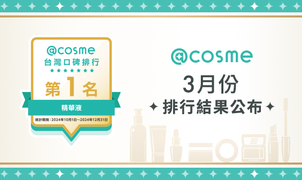 @cosme 堅持完全以消費者意見為中心,透過網路社群的力量,忠實呈現最公正,真實的美妝排行結果,故於每月公佈近三個月、近六個月台灣口碑排行商品名單,作為美妝市場上重要的參考指標。